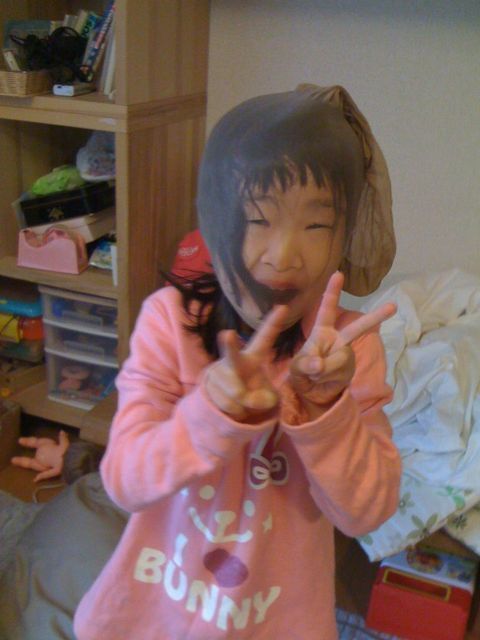 最初は足に履いて喜んでいたのですが、しばらくして「頭にかぶる!」と宣言してこの姿に。。。