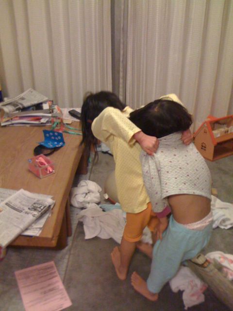 それを見たモモカもうらやましがり、「桃も!桃も!」と朝から二人で穴の開いた靴下の取り合いに。