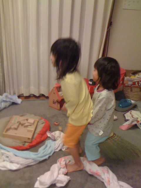 我が家の姉妹も風呂あがりにホウキを発見!散らかり放題の部屋で「キーキーGOGO!」の掛け声を掛けて何とか飛ぼうとしています。