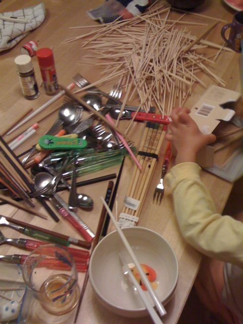 箸にスプーンにフォーク、あげくに300本入りでまだ10本も使用していない竹串がテーブルいっぱいに広げられています。