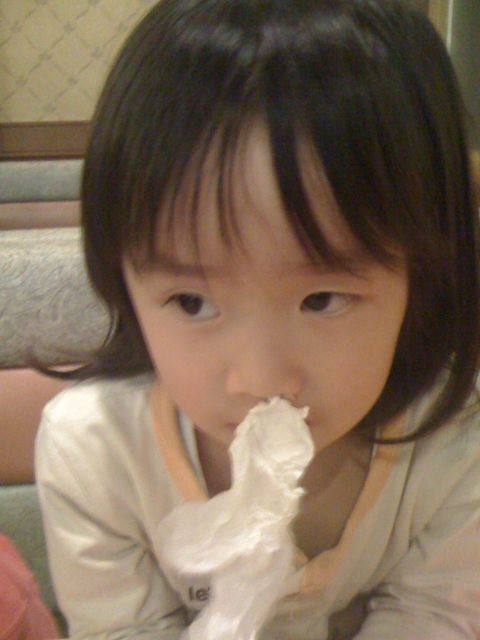 鼻にナフキンを詰め、「とんとんとんとんひげじいさん♪」と、機嫌良く歌う娘。